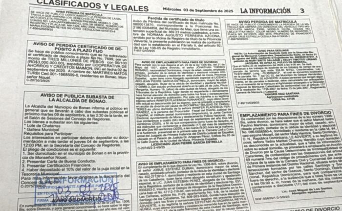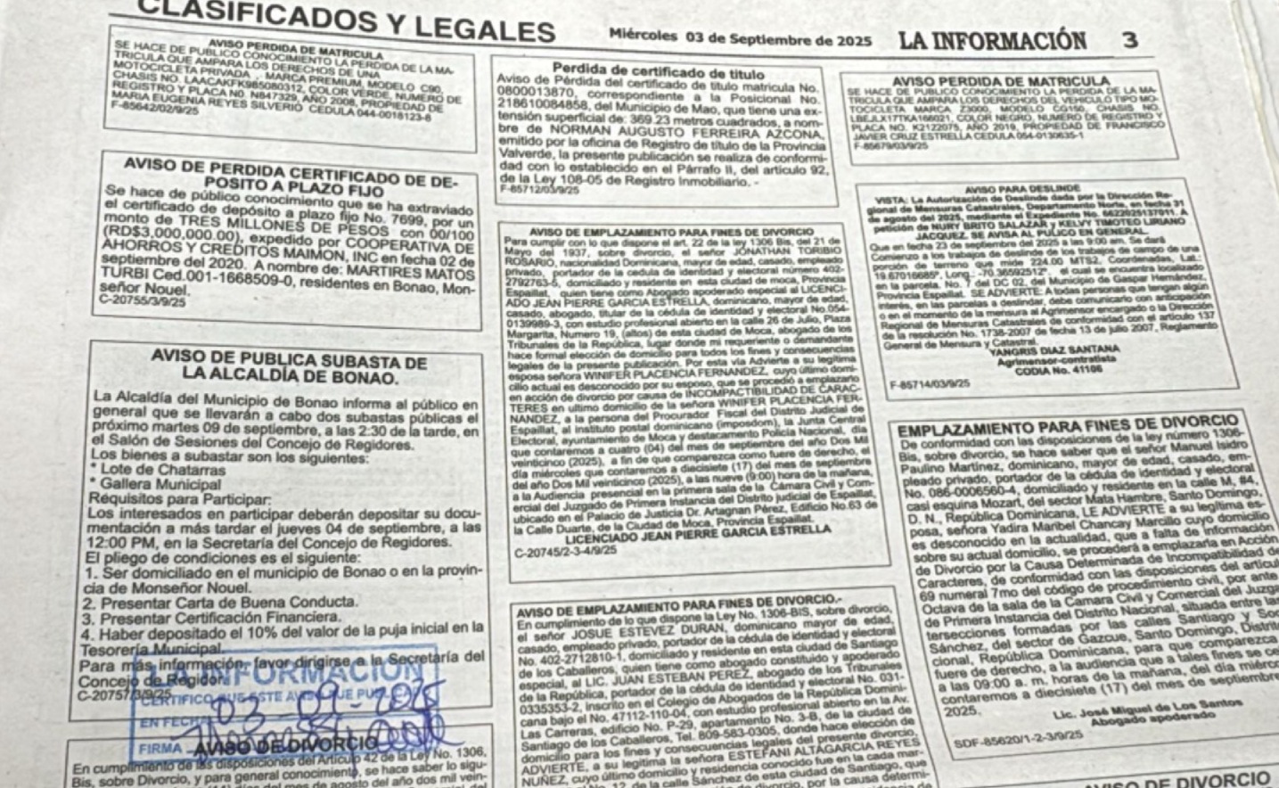 La Alcaldía del Municipio de Bonao informa al público en general que se llevarán a cabo dos subastas públicas el próximo martes 09 de septiembre, a las 2:30 de la tarde, en el Salón de Sesiones del Concejo de Regidores.